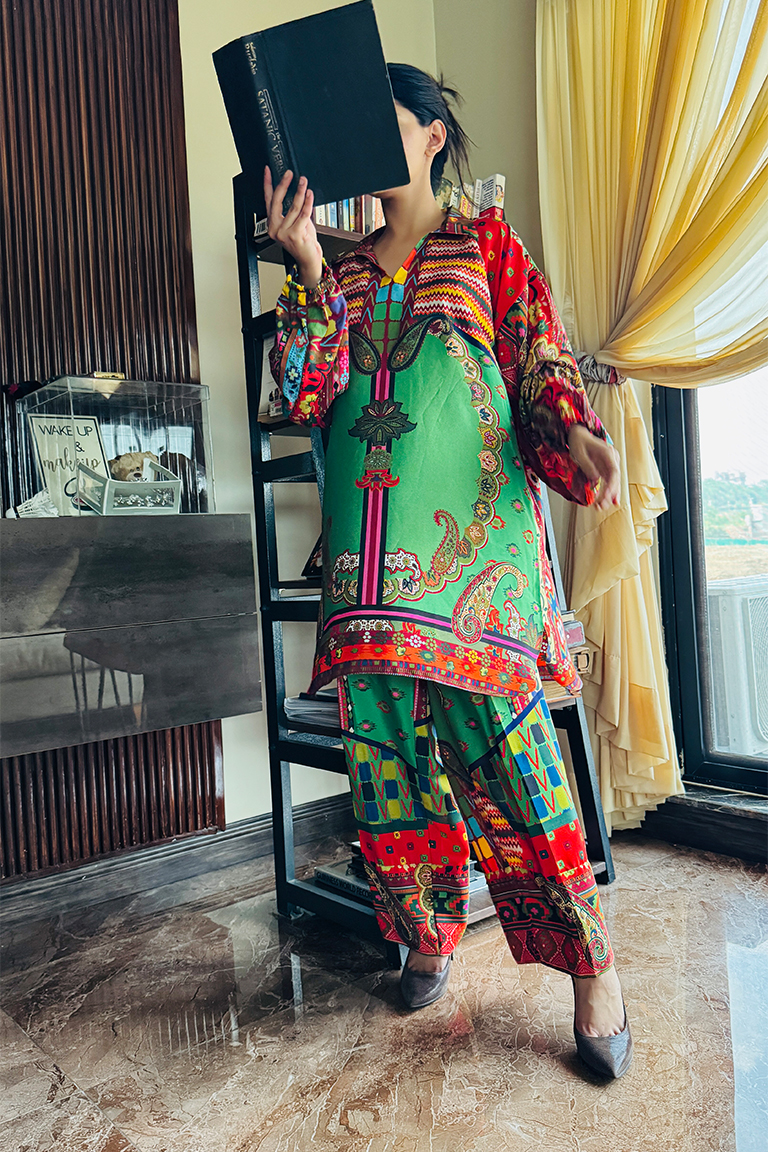 Make a statement with this striking coord set, designed for women who love confidence and style. Featuring a rich green base contrasted with bold red accents, this two-piece set blends elegance with a modern edge.