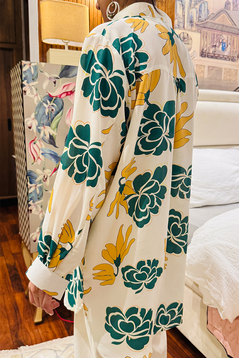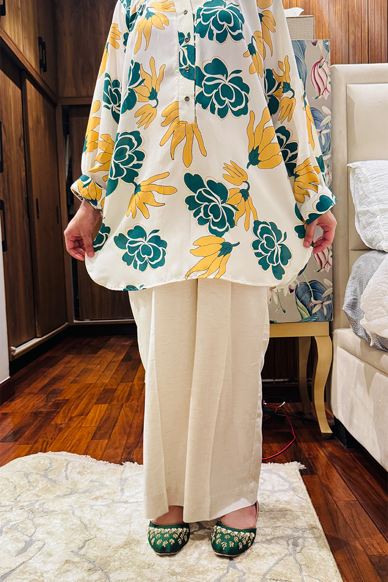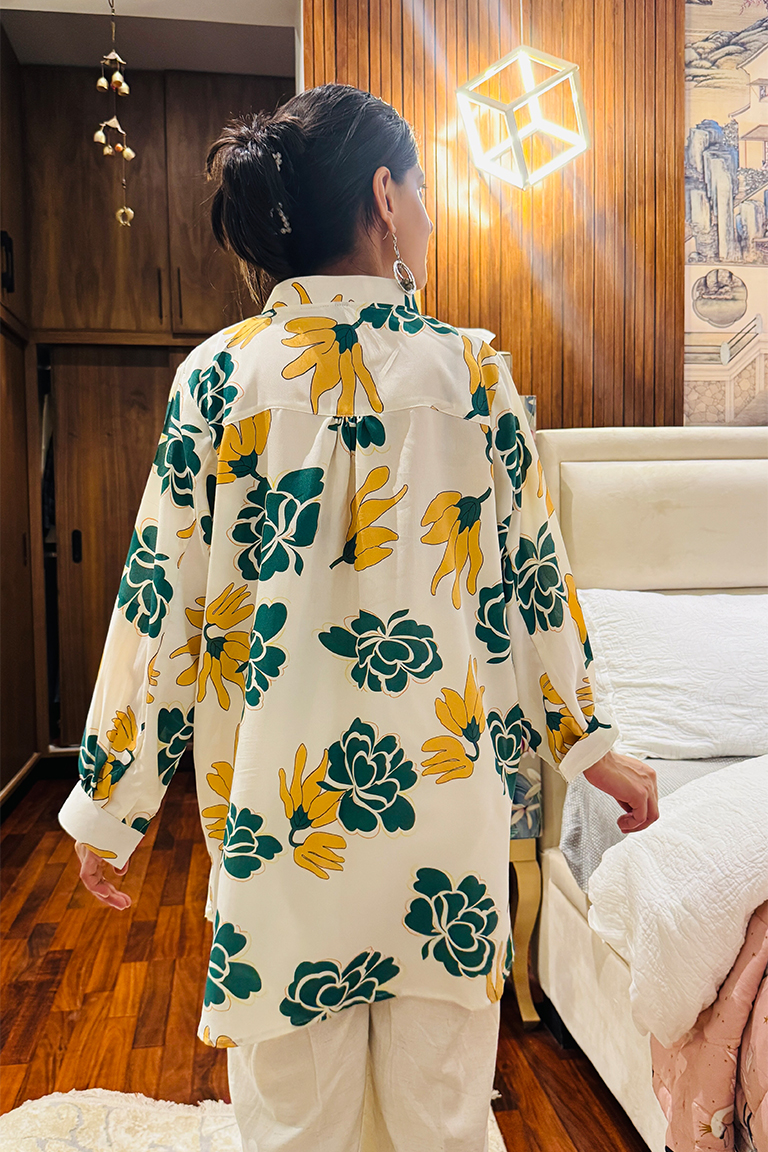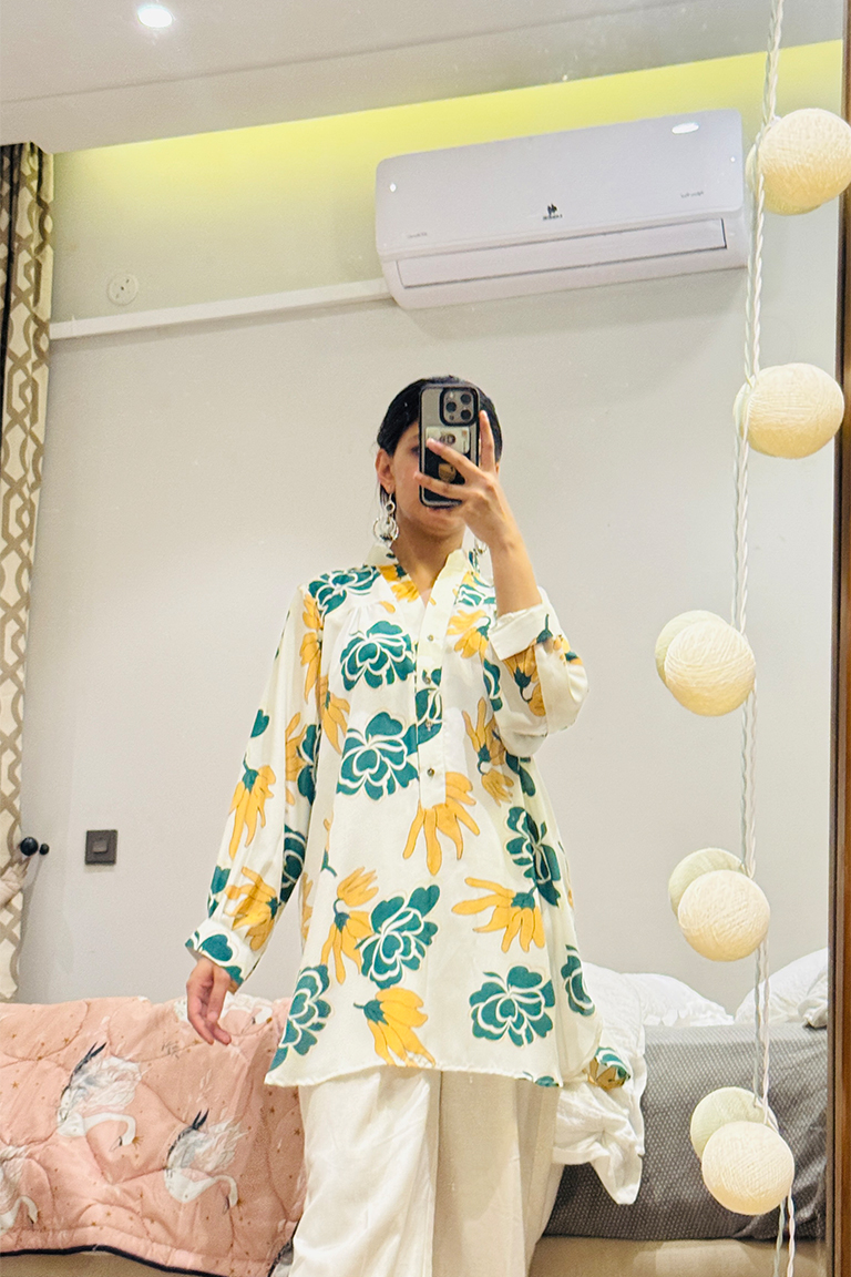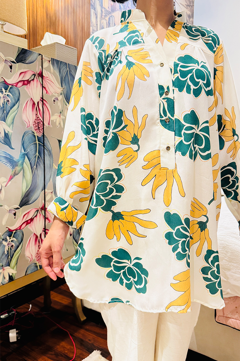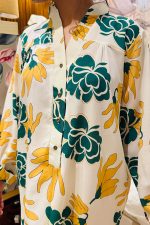 Step into effortless style with our Sunlit Bloom Tunic, designed to brighten up your wardrobe. Crafted from soft, breathable fabric, this white base shirt is adorned with bold yellow and teal floral prints, giving it a refreshing and vibrant appeal. This relaxed fit make it perfect for casual outings, brunches, or a breezy day out. Pair it with white trousers for a chic look or denim for a trendy twist.
